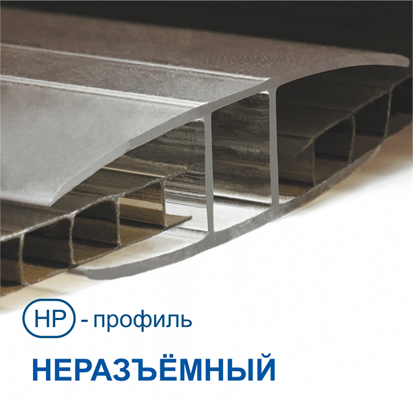 Соединительный неразъемный профиль предназначен для соединения листов поликарбоната, после монтажа он создаёт вид сплошного покрытия. В основном профили используются при монтаже небольших размеров скатных навесов и вертикальных конструкций (офисные перегородки, световые короба, рекламные щиты и т. п.). Цветовая гамма соответствует цвету панелей. Длина профиля — 6 метров. В наличии имеются профили для панелей толщинами 4-10 мм