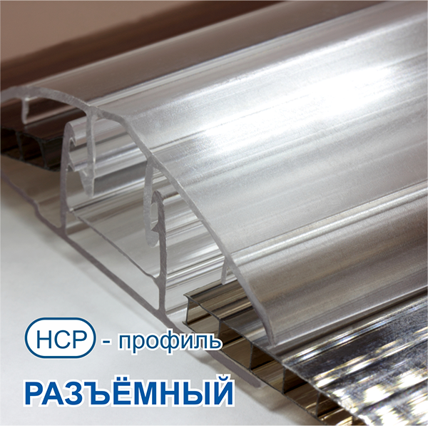 Разъемный профиль (HSP) состоит из 2-х частей: нижней базы и защелкивающейся крышки. Удобен при монтаже, применяется при толщине листов сотового поликарбоната от 6 до 16 мм и длине стыка от 3 метров. Привязка к каркасу осуществляется следующим образом: «база» профиля крепится к панели и устанавливается «крышка» профиля, которая при надавливании «защелкивается», соединяясь с базой.