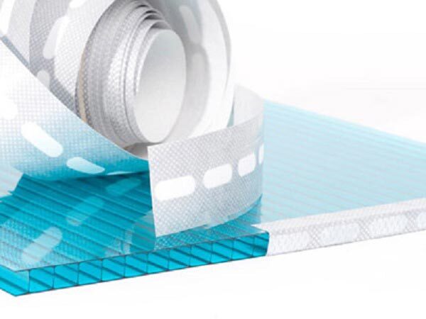 Герметизирующая лента применяется при монтаже поликарбоната для защиты от попадания внутрь панелей пыли, грязи, и насекомых. Герм ленту используют на верхних торцах поликарбоната. На нижних торцах применяют перфорированную ленту (для лучшего удаления конденсата). Лента шириной 25 мм рассчитана на толщину листа от 4 до 8мм., 38мм - на толщину 10мм.