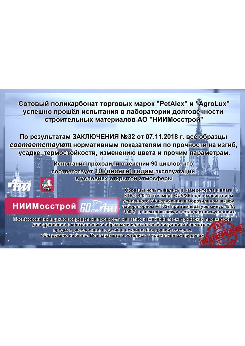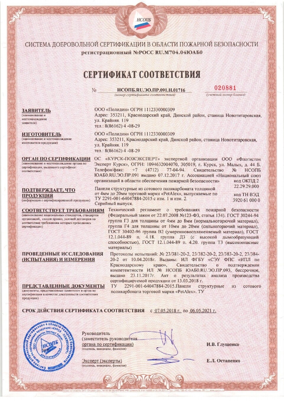 Сотовый поликарбонат серии Platino выпускается в полном соответствии с ГОСТ и обладает максимальными характеристиками прочности и долговечности. Это полновесная продукция, утолщённые перегородки, увеличенный слой защиты от УФ-излучения. Гарантия 20 лет. Сотовый поликарбонат премиум класса используется на любых ответственных государственных и прочих поднадзорных объектах.